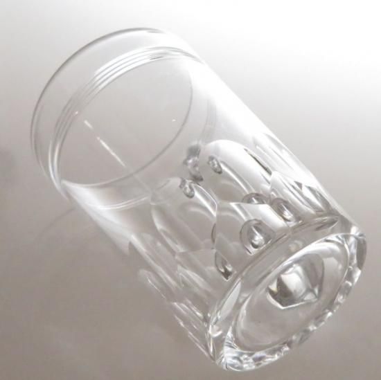 上には4本の線が、下にはうろこのようなカットがあるタンブラーグラスでございます。